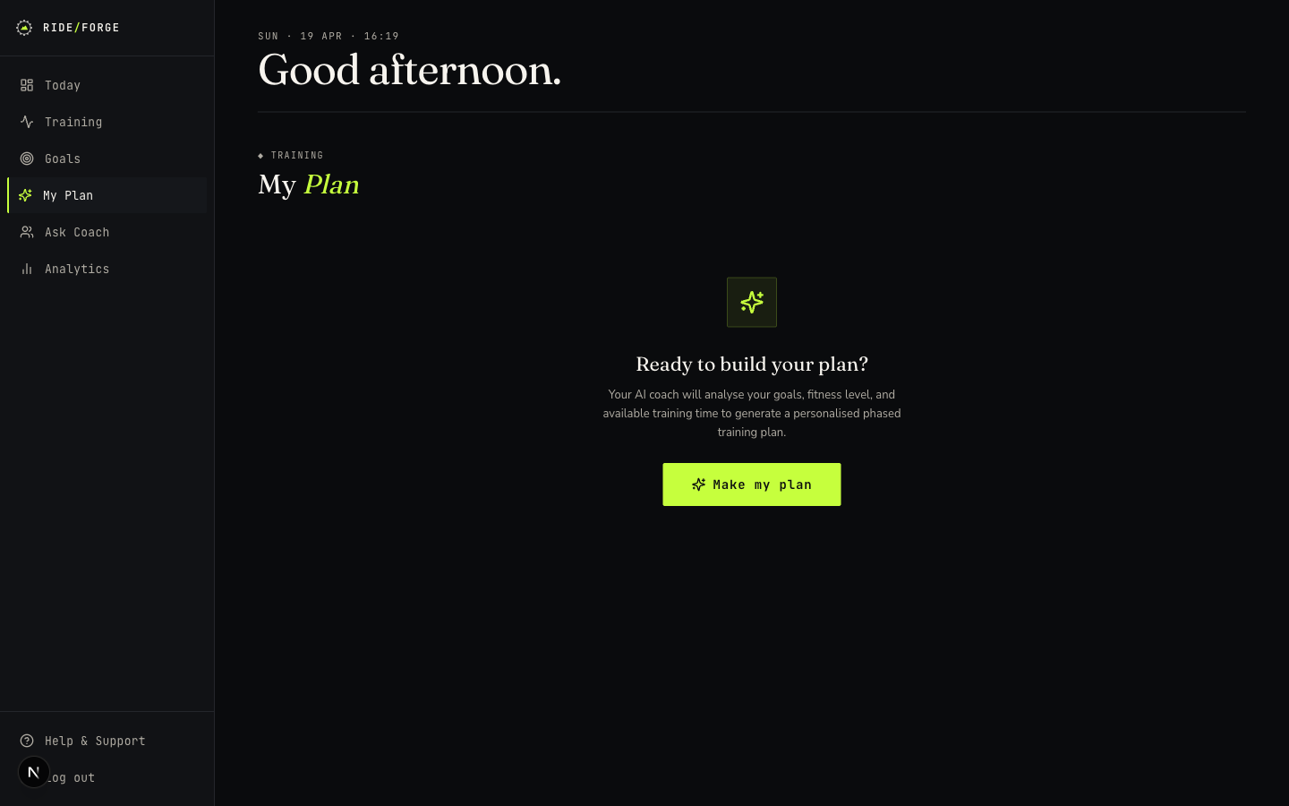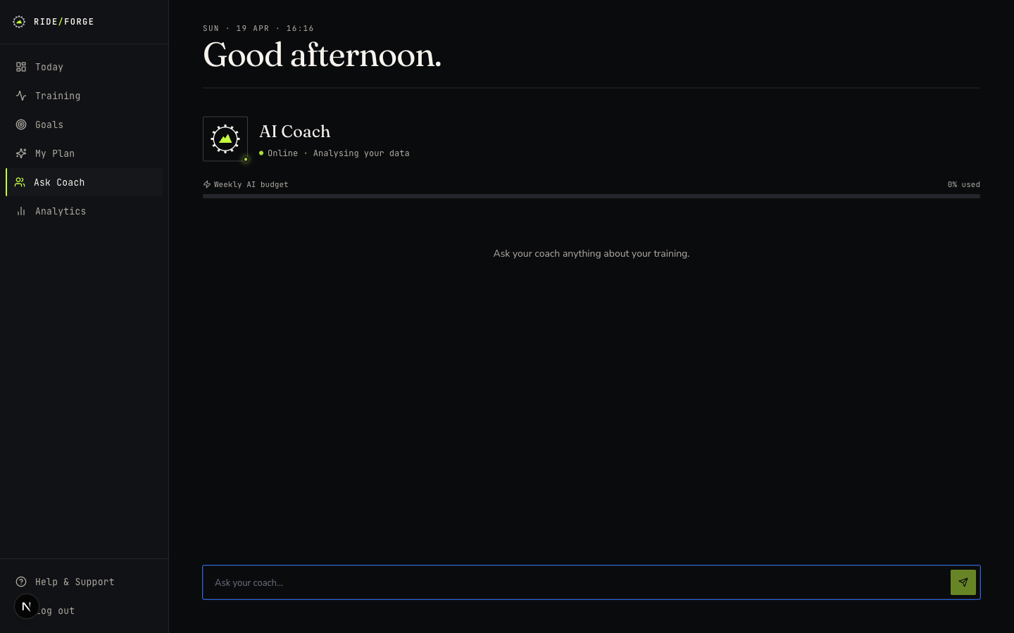 RideForge is a personal cycling coach for the goals that scare you. Audacious routes. Personal records. A Grand Tour. It reads your data, listens to your body, and writes the week that gets you there.